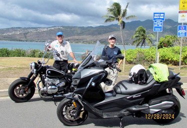Phil made arrangements for the BMW bikes via Riders Share, since no dealers rent BMWs in Hawaii anymore. And these were the only BMWs to be had on Oahu; nor were they co-located. P rented a giant R1800B with “ape-hanger bars” from Waikiki Jeep Rentals just a modest walk from the Ramada. Then we rode southwest of town where a young guy had a C400GT scooter available. Unbelievably, we had to stop for gas as the R18’s low-fuel light came on. We were told the R1800’s tank was likely full, but we didn’t take the time to check…