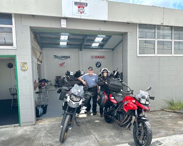 We also were renting m/c jackets and pants (to save luggage space in our many transits through airports}. They found items for P that were a bit large, but acceptable. The items they had for Karen were way too large. Her hands didn’t reach beyond the jacket sleeves (mens’ small) and the knee pads were at her shins (size 50). Since