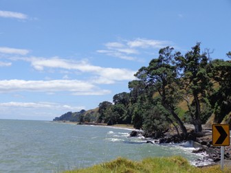 With nary a cloud in the sky, we were hoping for a warmer day. We loaded up and headed south on Rte 1 motorway through Auckland. This was a hectic ride, as reportedly 1/3 of the entire population of NZ lives in Auckland, and more people live in Auckland than on the entire South Island! Traffic was calmer after we got past the city. However, by then the clouds were thick and it was chilly. Eventually we turned east on Rte 2 toward the coast then north on Rte 25, heading for the Coromandel Peninsula, where many rich Aucklanders have summer homes.